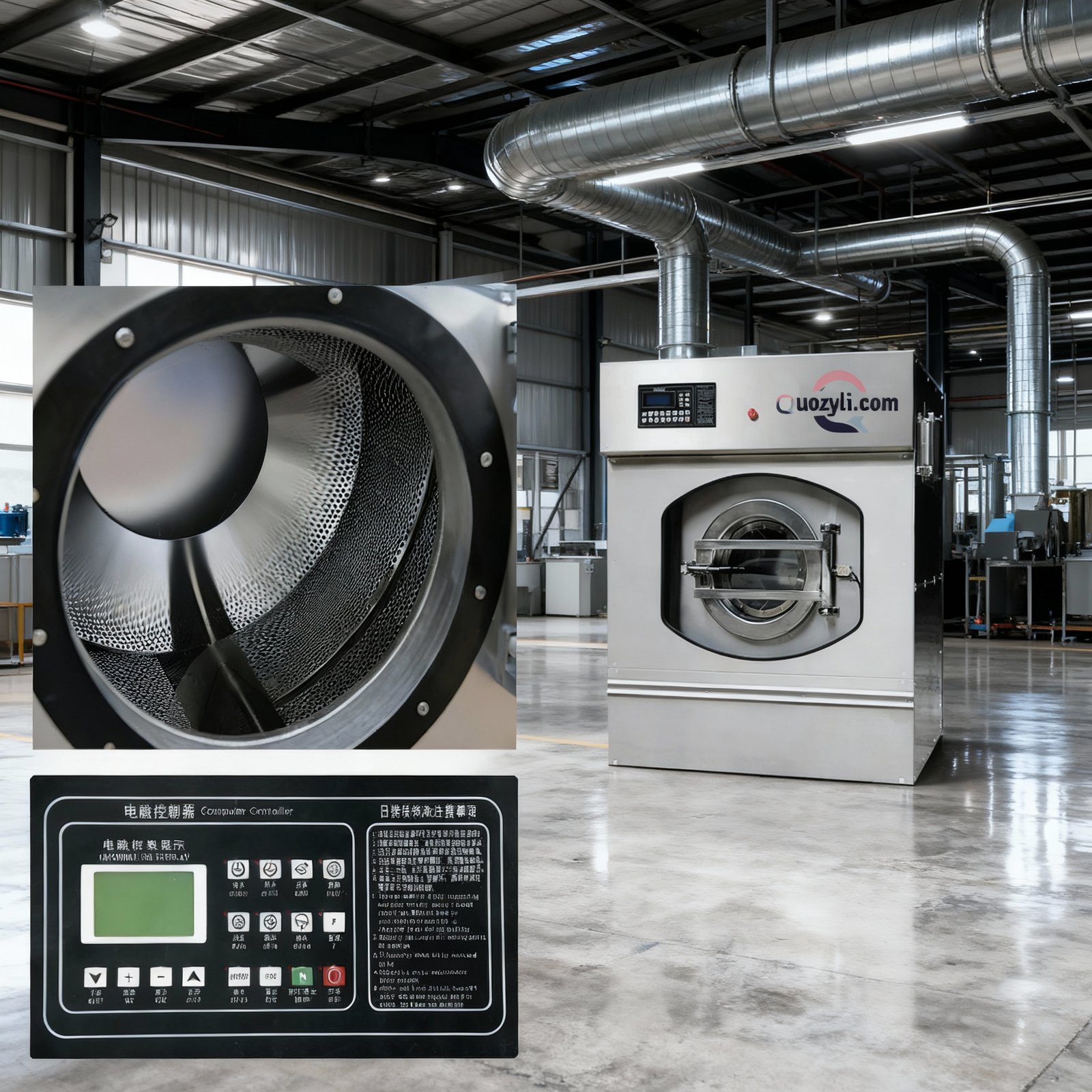 - Le fonctionnement est entièrement contrôlé par ordinateur, avec réglage de la vitesse par variateur de fréquence, dialogue homme-machine pour ajuster le programme de lavage, affichage clair sur écran LCD, et système d’auto-diagnostic pour la détection des pannes et la vérification des fonctions, facilitant ainsi l’entretien.
